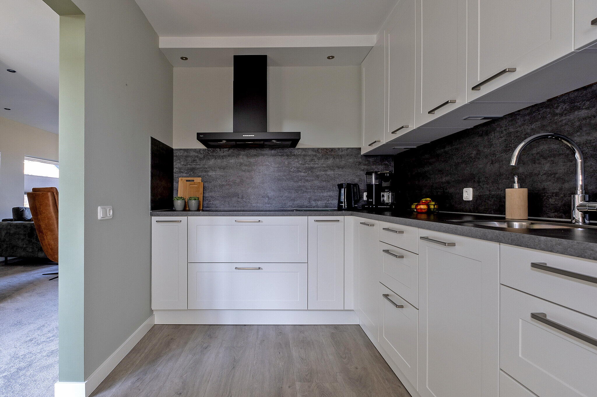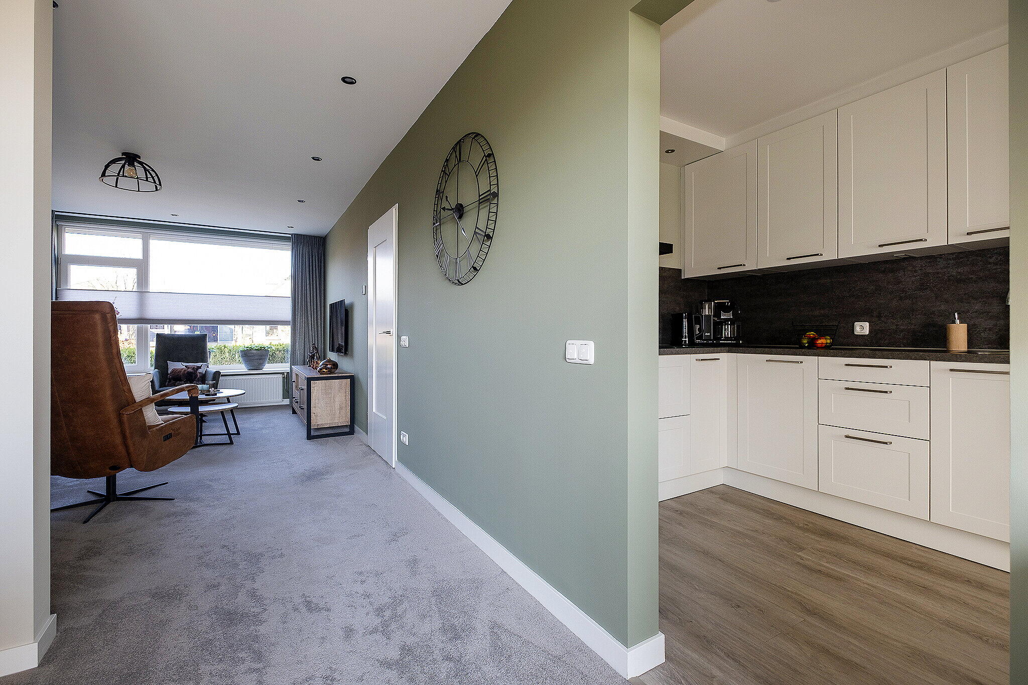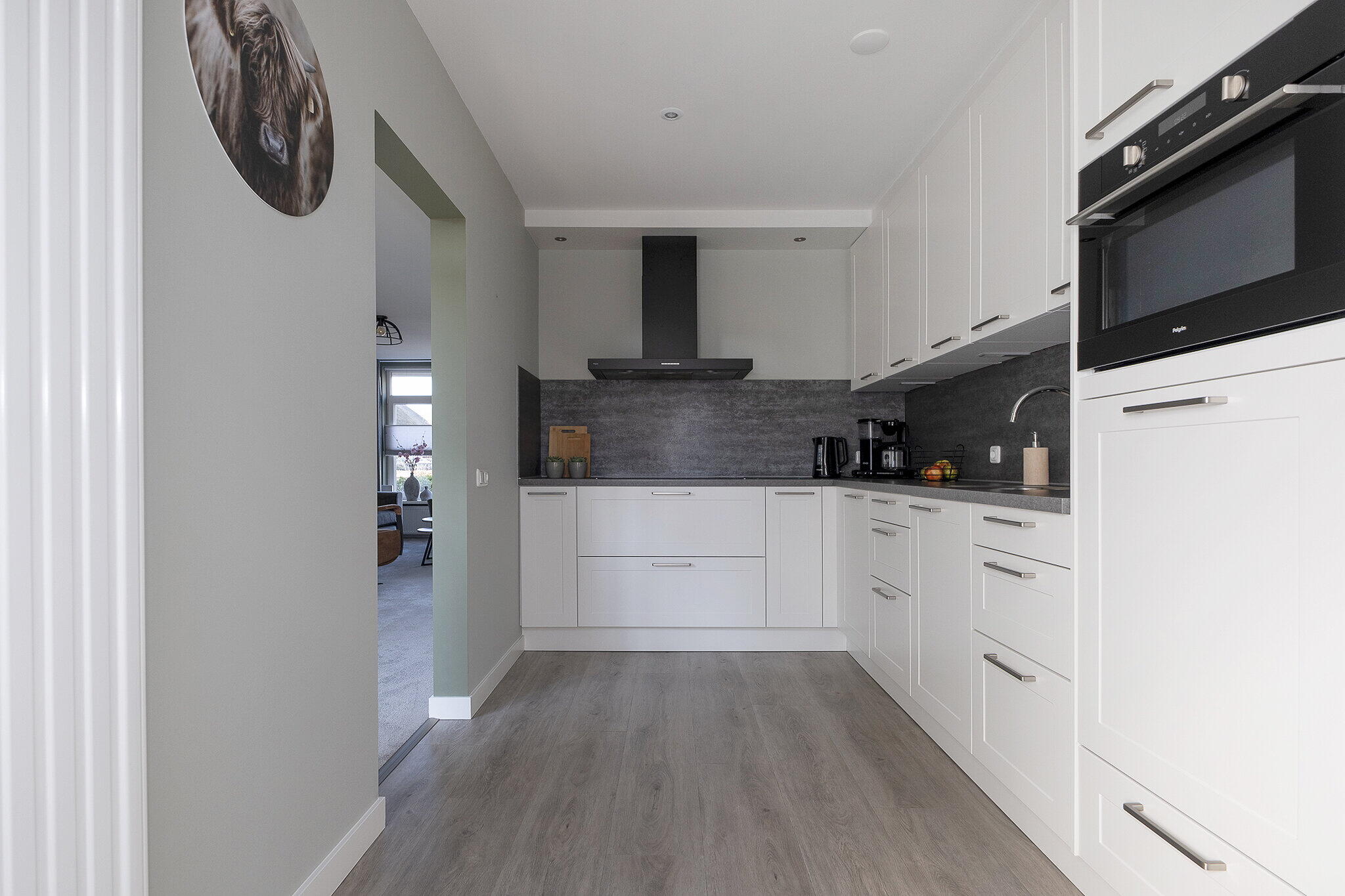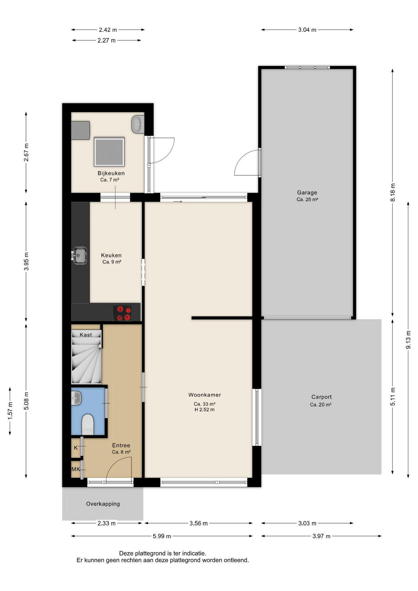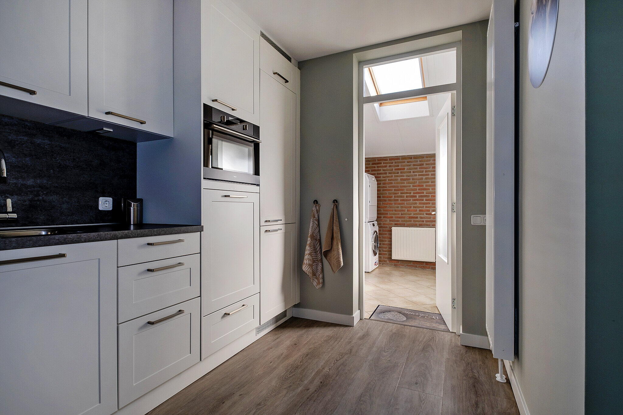 Via de entree komt u in een ruime hal met een toilet, meterkast en kelderkast onder de trapopgang. De lichte doorzonkamer (ca. 33 m²) beschikt over grote raampartijen. De halfopen keuken (ca. 9 m²) is voorzien van diverse inbouwapparatuur, waaronder een kookplaat, afzuigkap, oven, vaatwasser en voldoende bergruimte. Vanuit de keuken is de bijkeuken (ca. 7 m²) bereikbaar, waar zich aansluitingen voor het witgoed bevinden en directe toegang tot de prettige achtertuin.