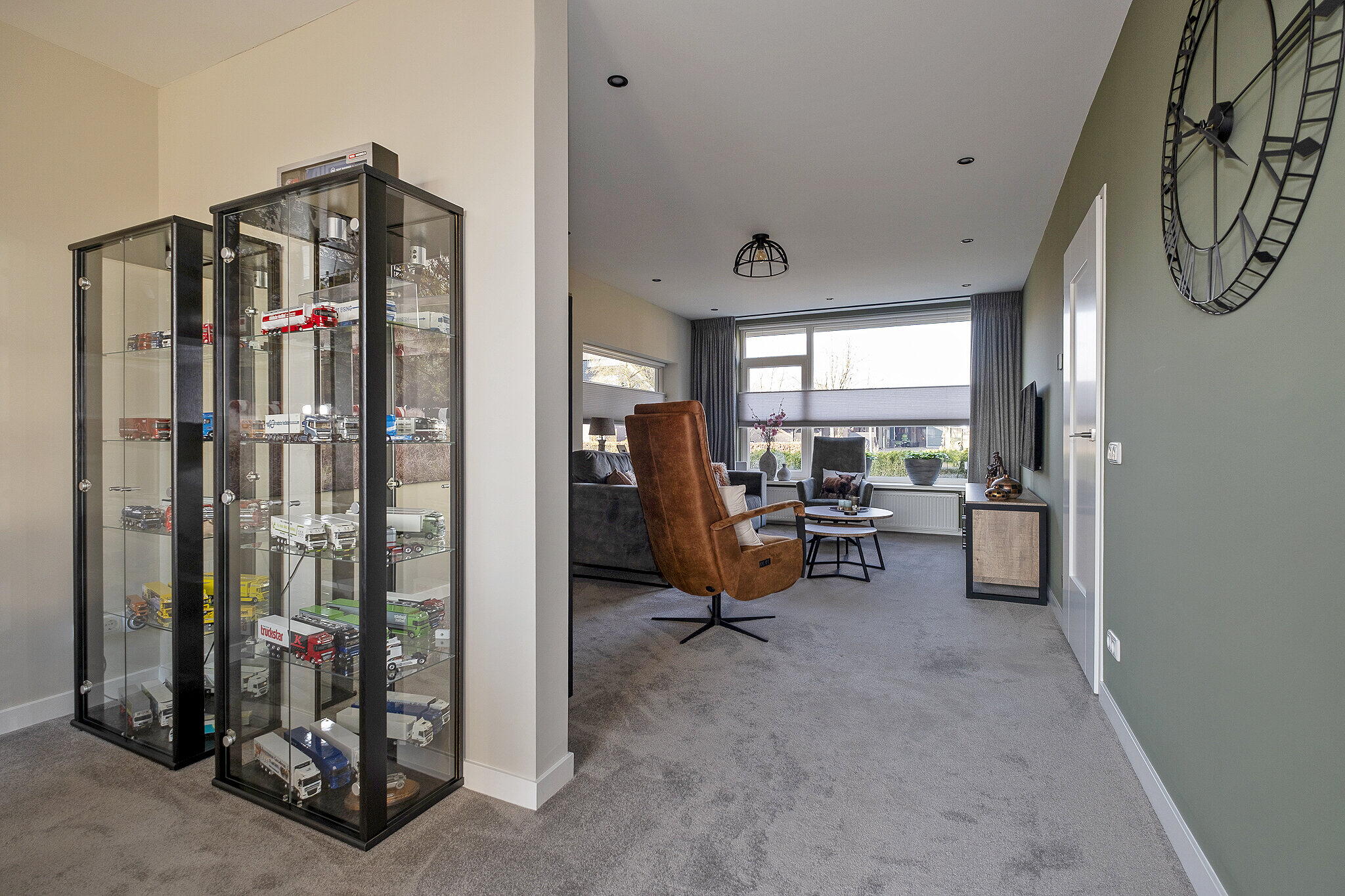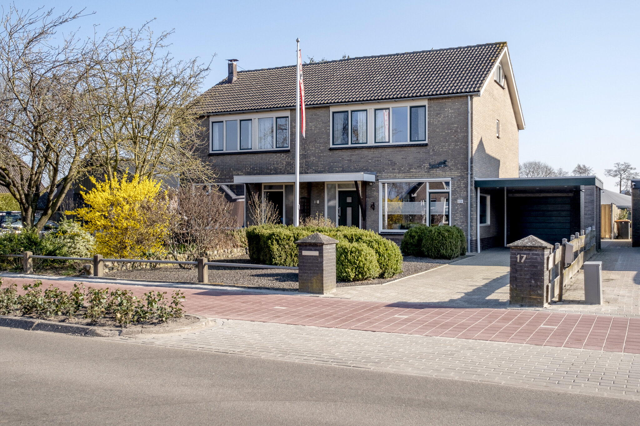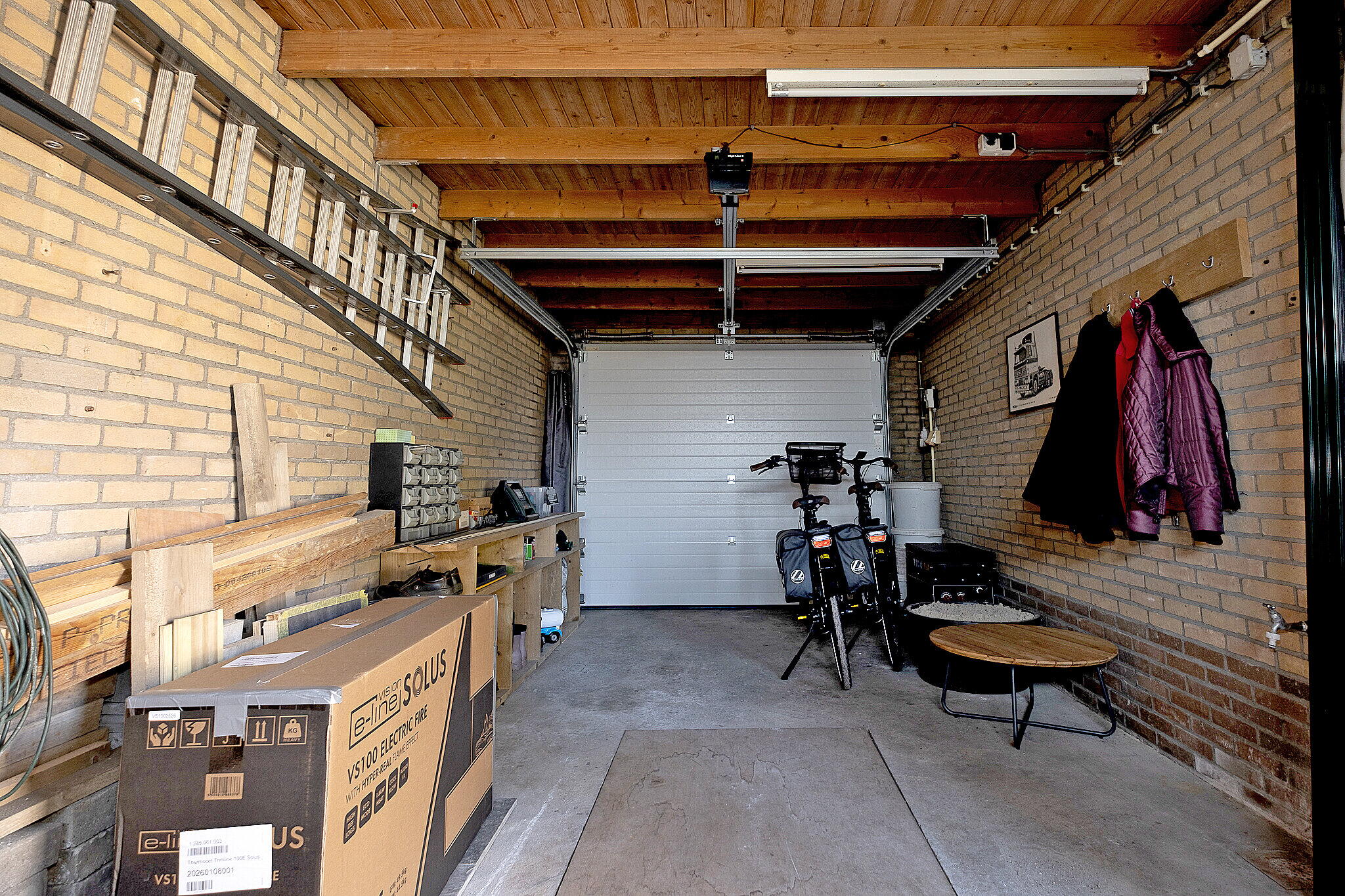 De aangebouwde garage is langer dan gebruikelijk en voorzien van een werkkelder. De geïsoleerde overheaddeur is elektrisch. Aan de voorzijde is een royale carport gerealiseerd, waar meerdere auto's op eigen terrein kunnen worden geparkeerd.