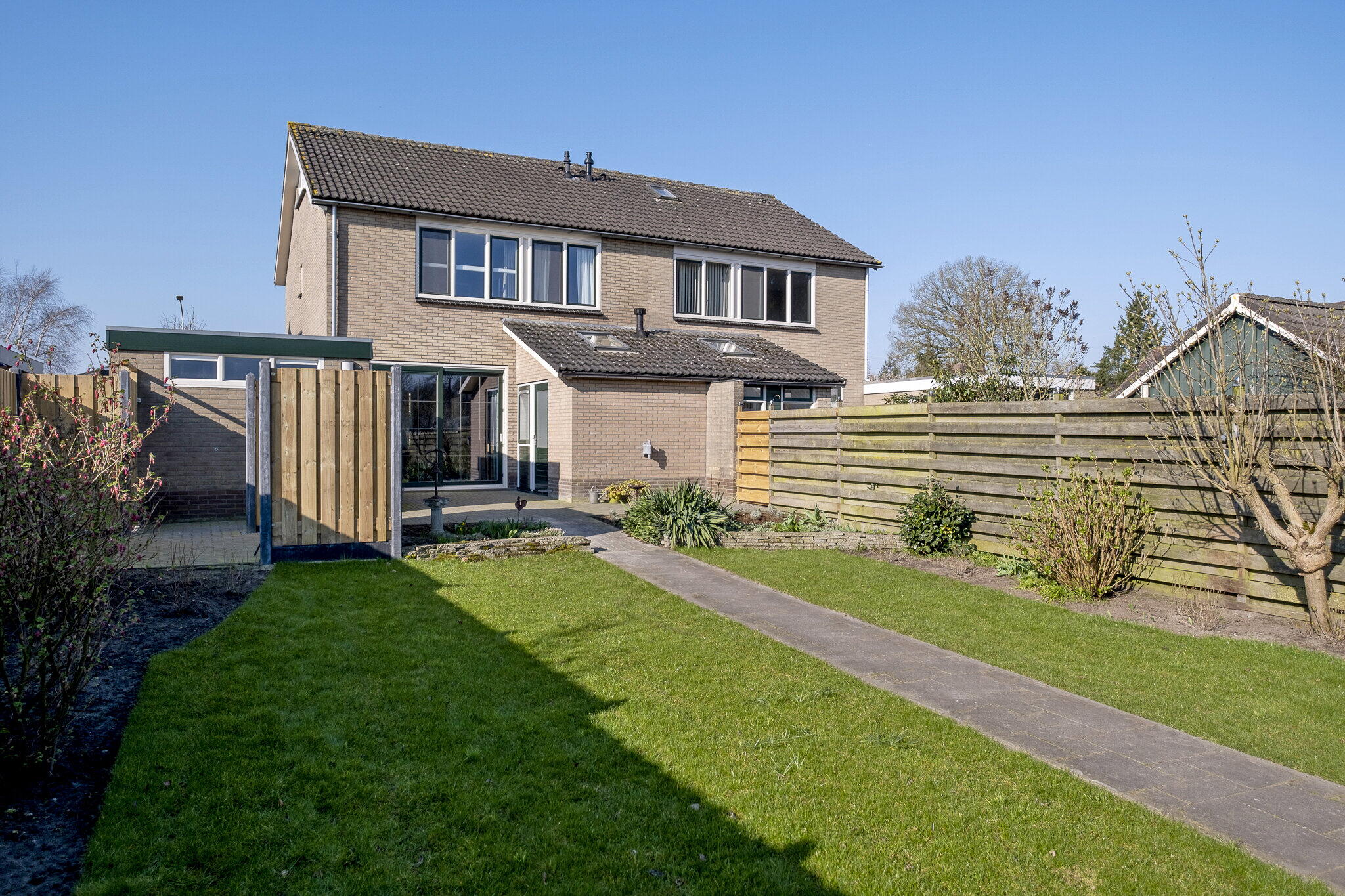 De voor- en achtertuin zijn verzorgd aangelegd en onderhoudsvriendelijk ingericht. De achtertuin, gelegen op het noordoosten, biedt veel privacy en een prettige buitenruimte. Daarnaast is er een houten berging (ca. 11 m²) aanwezig.
