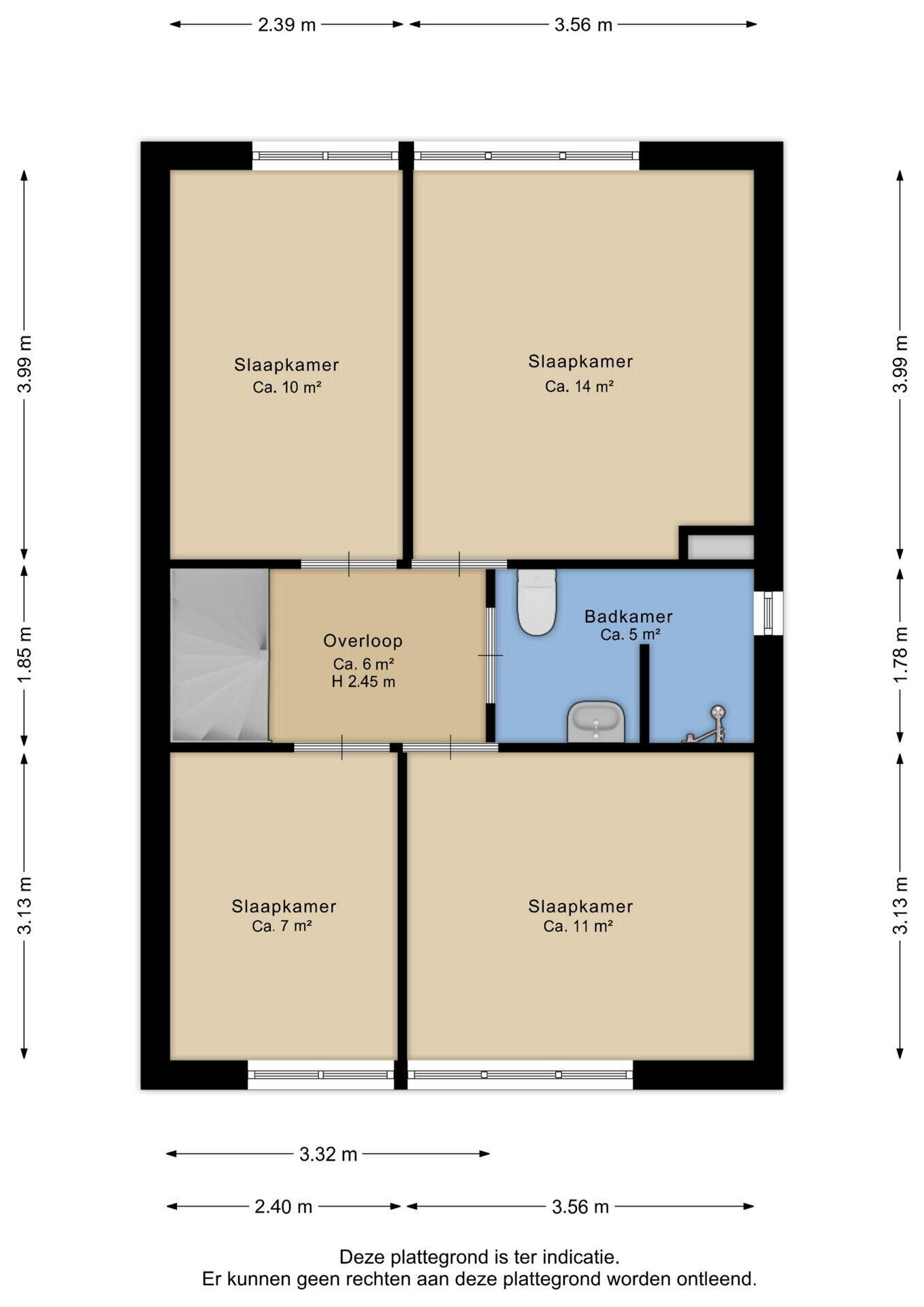 De overloop geeft toegang tot vier slaapkamers (ca. 14 m², 11 m², 10 m² en 7 m²) en de moderne badkamer (ca. 5 m²) met douche, toilet, wastafelmeubel en designradiator.